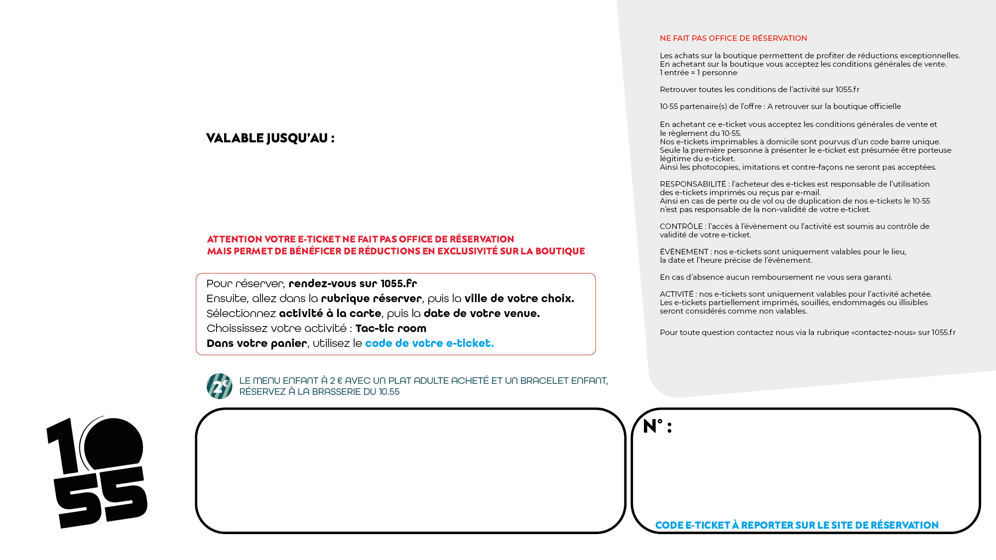- Validité : Le e-ticket est valable 2 ans à compter de la date d’achat