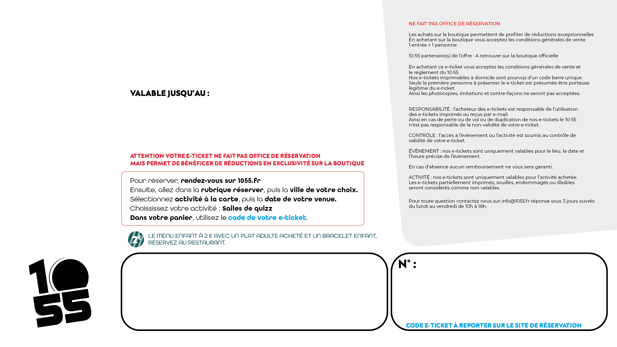 - Validité : Le e-ticket est valable 2 ans à compter de la date d’achat