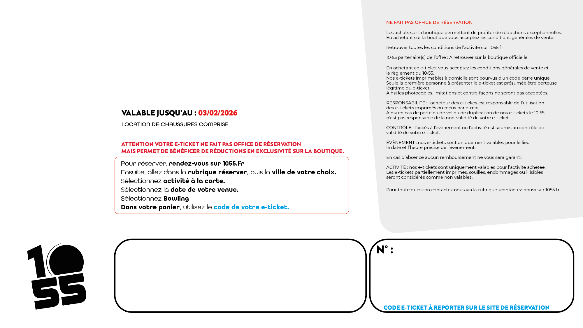 Pour réserver vos activités, rendez vous sur 1055.fr puis Réservez et sélectionnez la ville de votre choix. Puis suivez les étapes sur le site de réservation. Dans votre panier, rentrez le code disponible sur votre e-ticket reçu par e-mail.