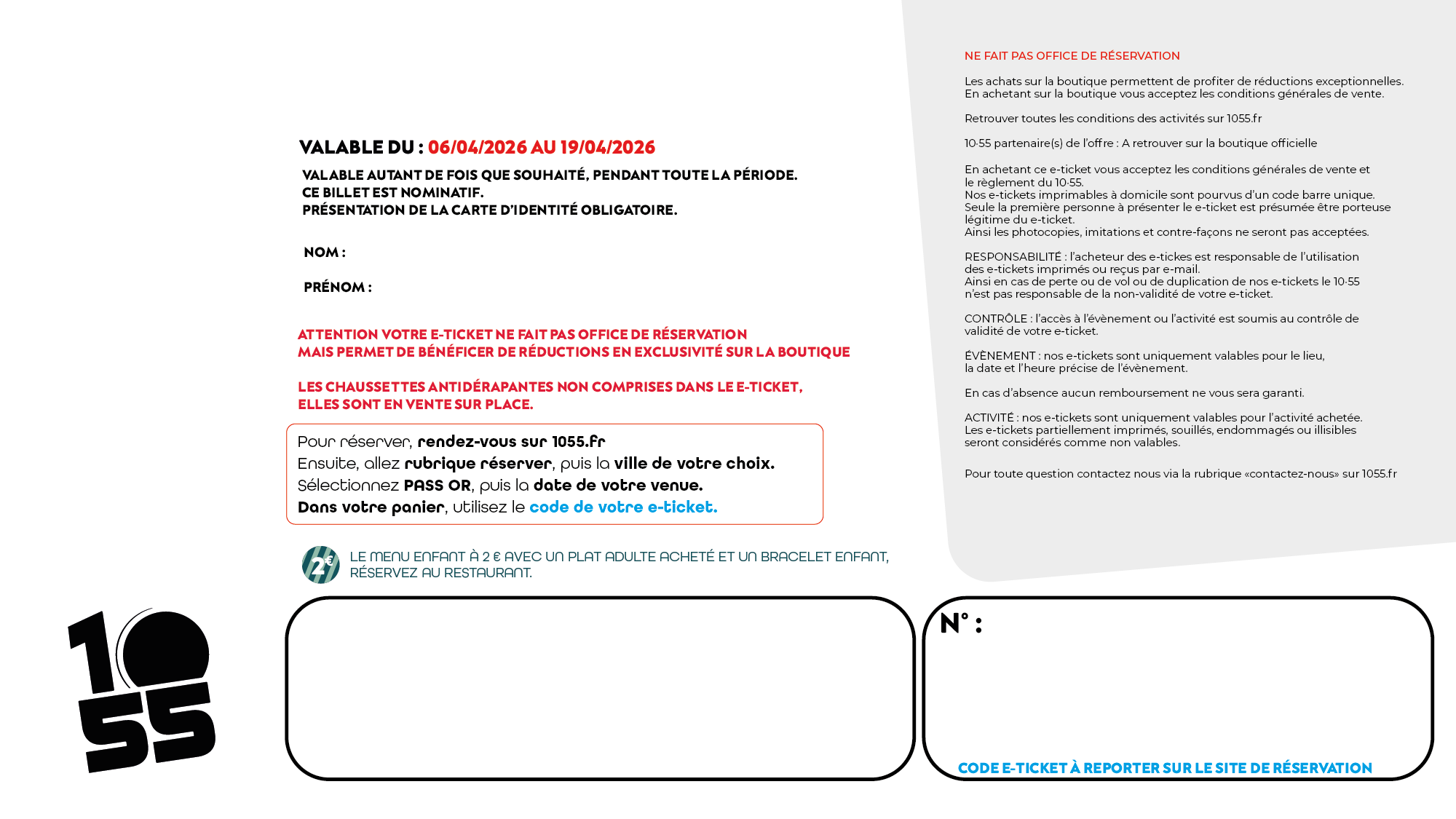 Réservation conseillée via 1055.fr, rubrique « Réservez », puis sélection de votre établissement. Sélectionnez «Nos Pass », puis « Pass Or »